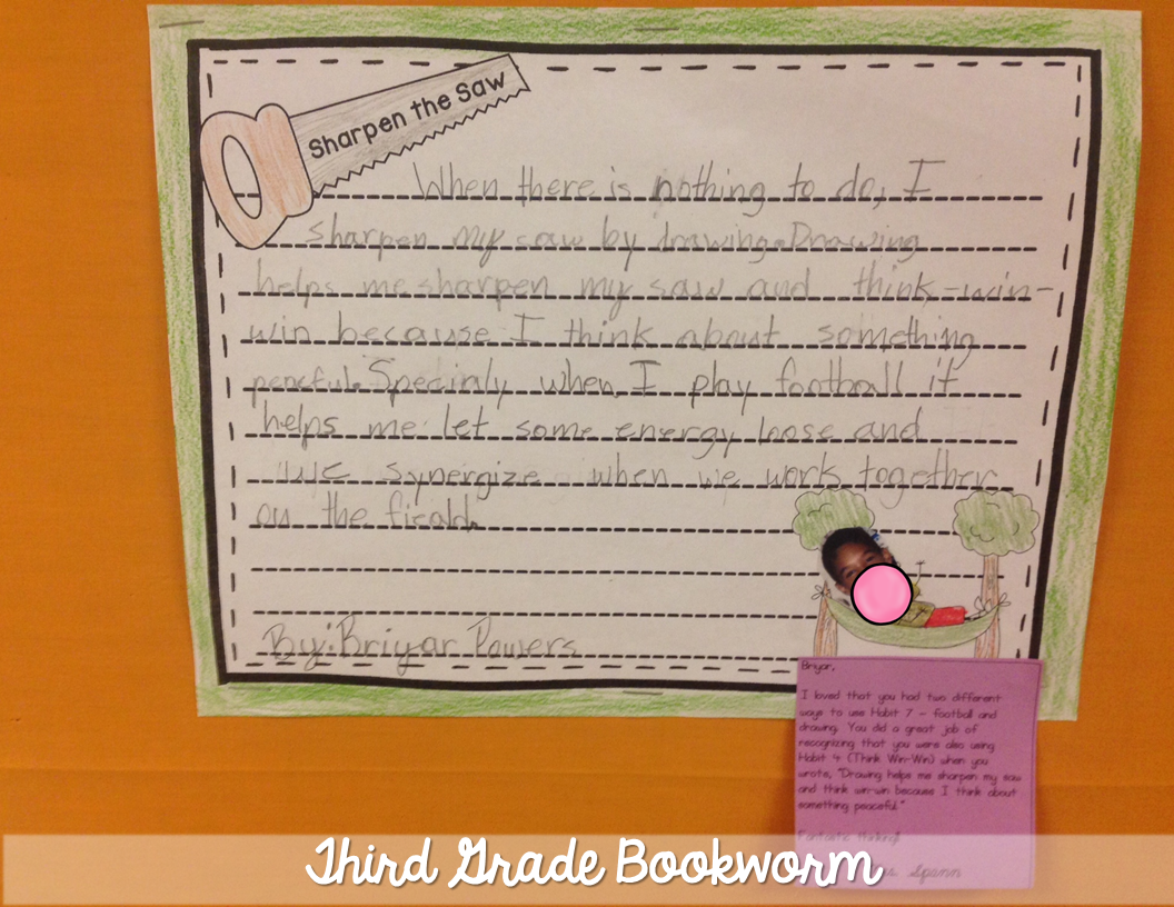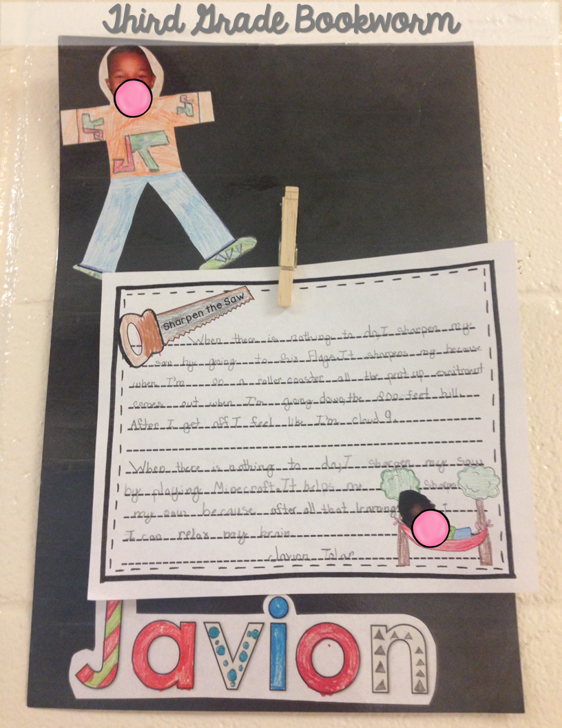 These were up during our Leadership Day a couple of weeks ago, and I had a couple of visitors tell me how much they enjoyed reading the kids’ pieces and looking at all of their bobbleheads. ๐ I’ve also used them in place of name tags on our Homeworkopoly board, as labels on job cards, etc. It adds a bit of “spunk” to our classroom and we like it that way!